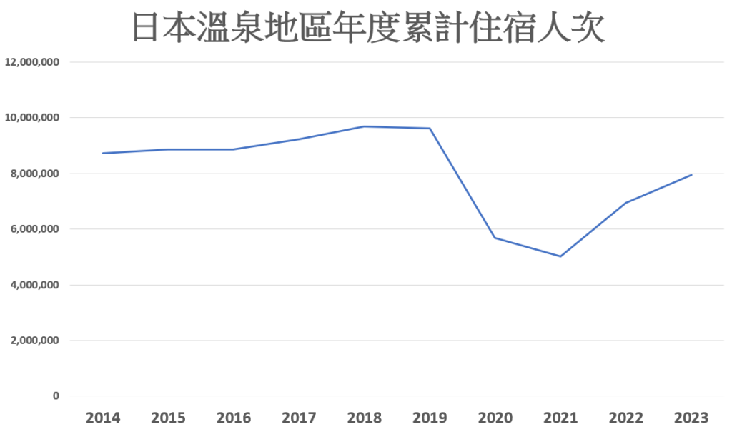 根據日本環境省公布的數據,溫泉地區的年度累計住宿人次在疫情後呈現明顯回升趨勢。2019 年疫情前,溫泉地區年度住宿人次曾達 961.8 萬人次,2020 年起因疫情急遽下滑至 568.6 萬人次,2021 年更進一步降至 502.8 萬人次。隨著邊境管制解除與觀光需求回溫,2022 年回升至 694.9 萬人次,2023 年已增至 795.9 萬人次。相關單位指出,外國旅客的回流,是帶動溫泉地區住宿人次快速回升的重要因素之一。