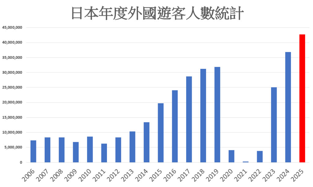 日本觀光市場全面復甦,外國旅客人數持續攀升,2025年全年赴日遊客首度突破4,000萬人次,創下歷史新高,顯示日本成為全球熱門旅遊目的地之一。
